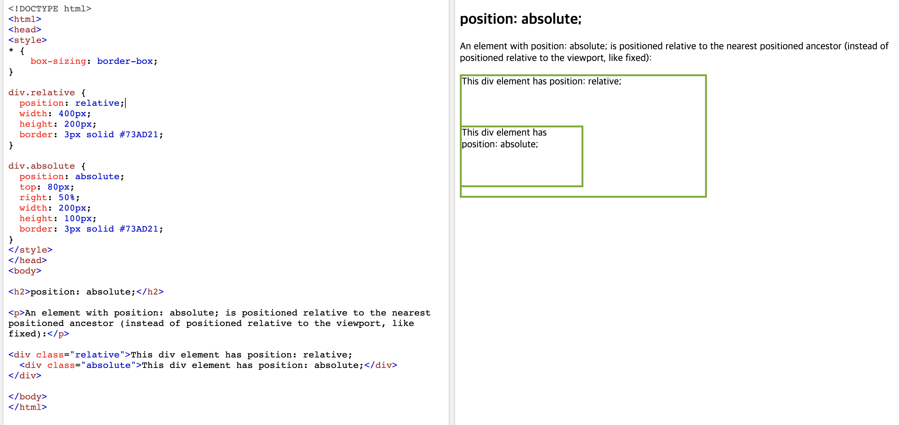 position: absolute가 지정된 요소는 부모 요소 또는 가장 근접한 곳에 위치한 조상 요소의 위치를 기준으로 좌표 프로퍼티 (top, bottom, left, right)를 통해 위치를 지정할 수 있다. (이 때, 부모 요소의 position은 static 이외의 요소로 지정되어 있어야 하며, 만약 없을 경우에는 문서 전체를 기준으로 잡아 position이 지정된다)